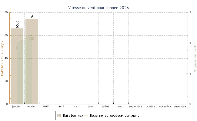 | fevrier | 2.2 °C | 6.5 °C | 16.6 °C | 13.9 °C | 10.2 °C | 2.3 km/h | 74.0 km/h | ESE |