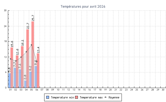 | 05 | 6.2 °C | 25.7 °C | 16.6 °C | 0.1 km/h (14.5 km/h) | NO |